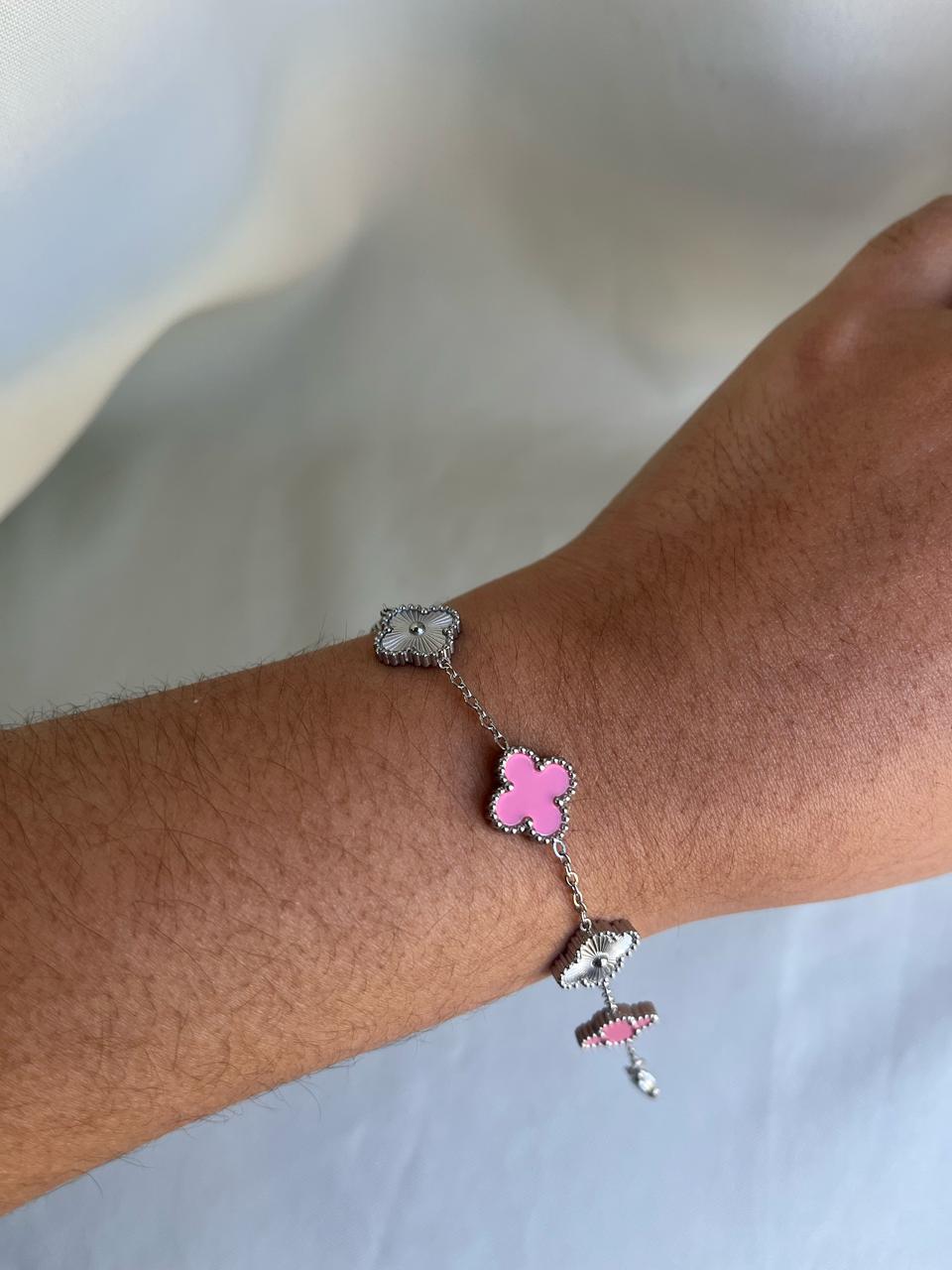 Pulsera con cinco dijes trébol combinados con rosa de acero blanco.