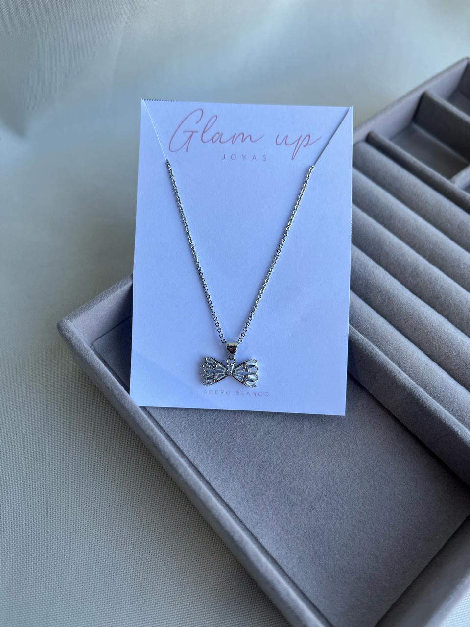 Cadena con dije moño con cubic de acero blanco.